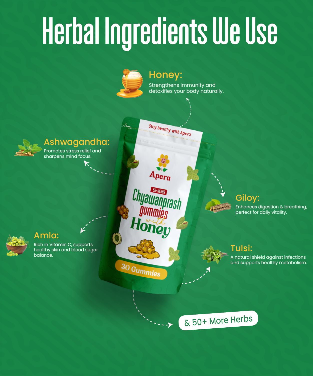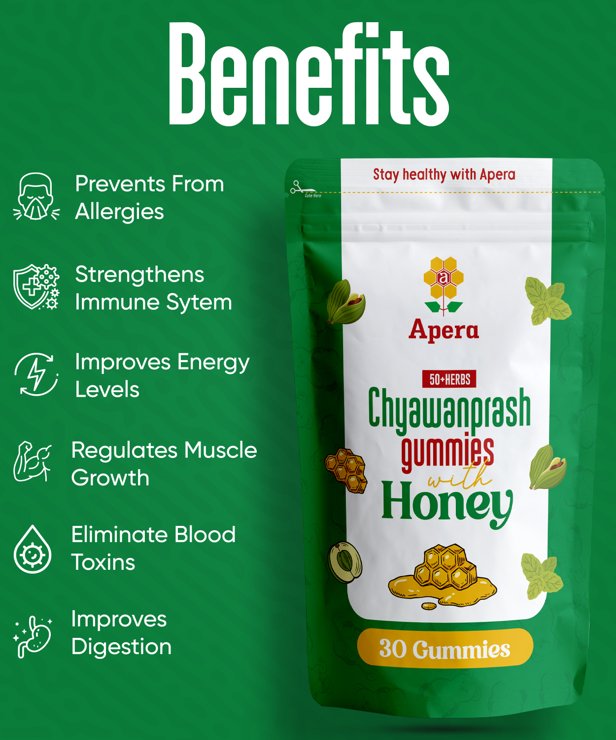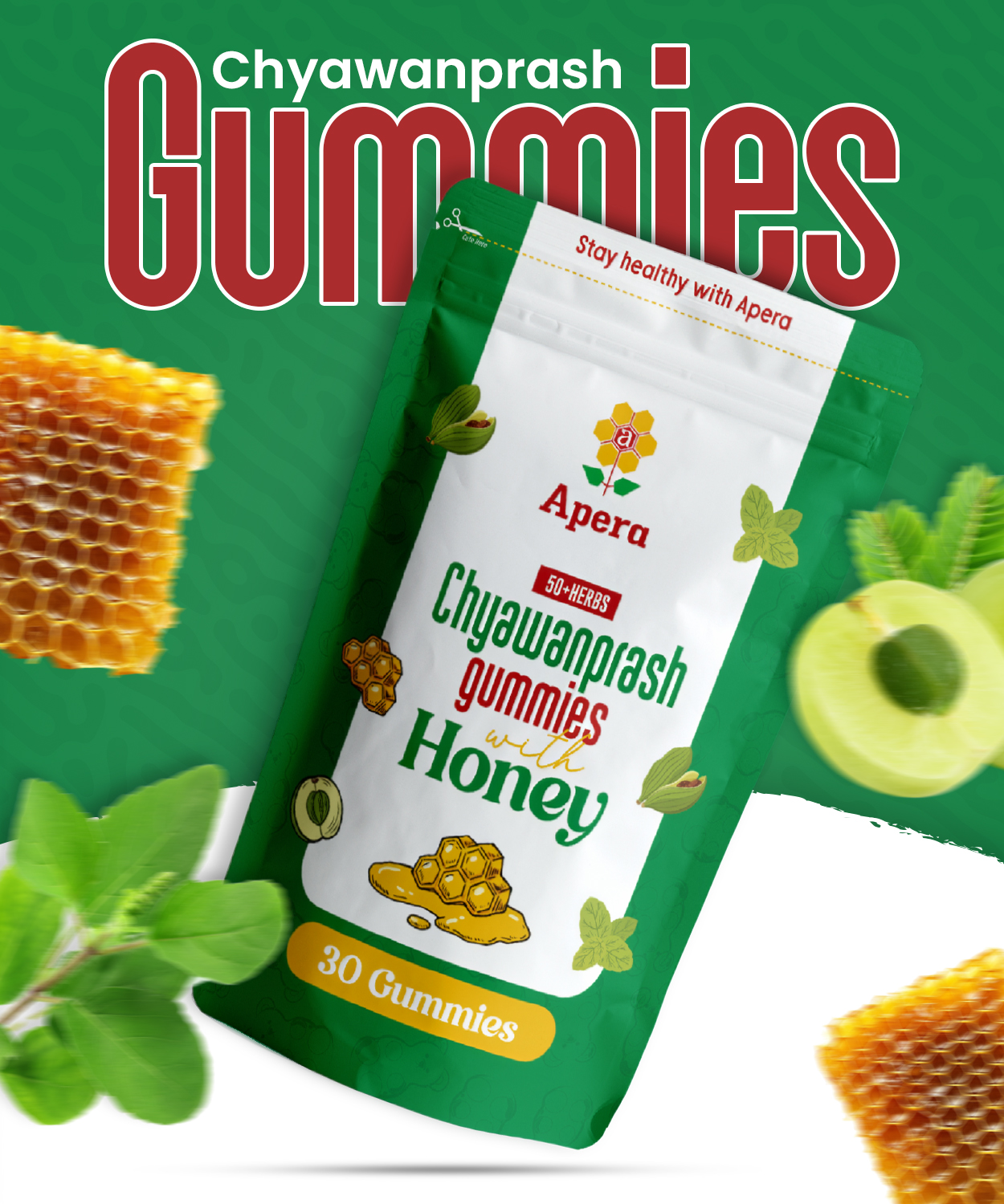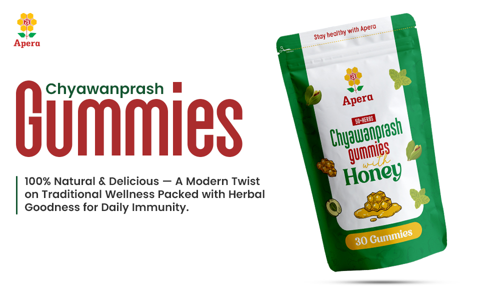 APERA Chyawanprash gummies with Honey are a unique and convenient dietary supplement crafted from natural Chyawanprash and honey. Chyawanprash is a traditional Ayurvedic herbal jam known for its diverse blend of herbs, spices, and other botanical ingredients. Combining this with honey enhances the sweetness and potentially adds additional health benefits.