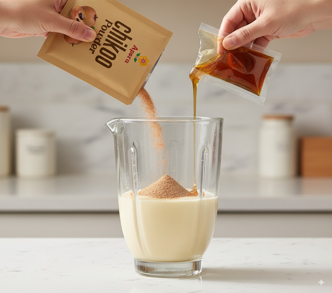 Once your custard has cooled, transfer it to a blender. Add one pouch of Apera Chikoo Powder and one pouch of Apera Pure Honey. The chikoo powder brings authentic fruit flavor without the hassle of peeling and blending fresh fruit, while the honey adds natural sweetness and a silky texture. Blend until smooth and creamy.